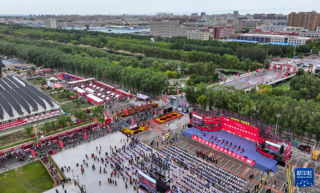这是10月1日在在宁夏吴忠市利通区牛家坊民俗文化村拍摄的第五届吴忠早茶美食文化节活动现场(无人机照片)。新华社记者 冯开华 摄