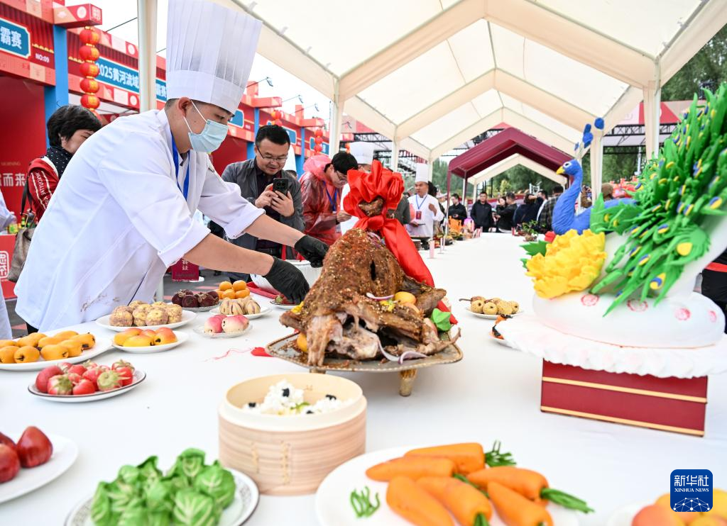 10月1日,在宁夏吴忠市利通区牛家坊民俗文化村举行的第五届吴忠早茶美食文化节厨艺争霸赛上,厨师为游客展示、介绍特色美食。新华社记者 冯开华 摄
