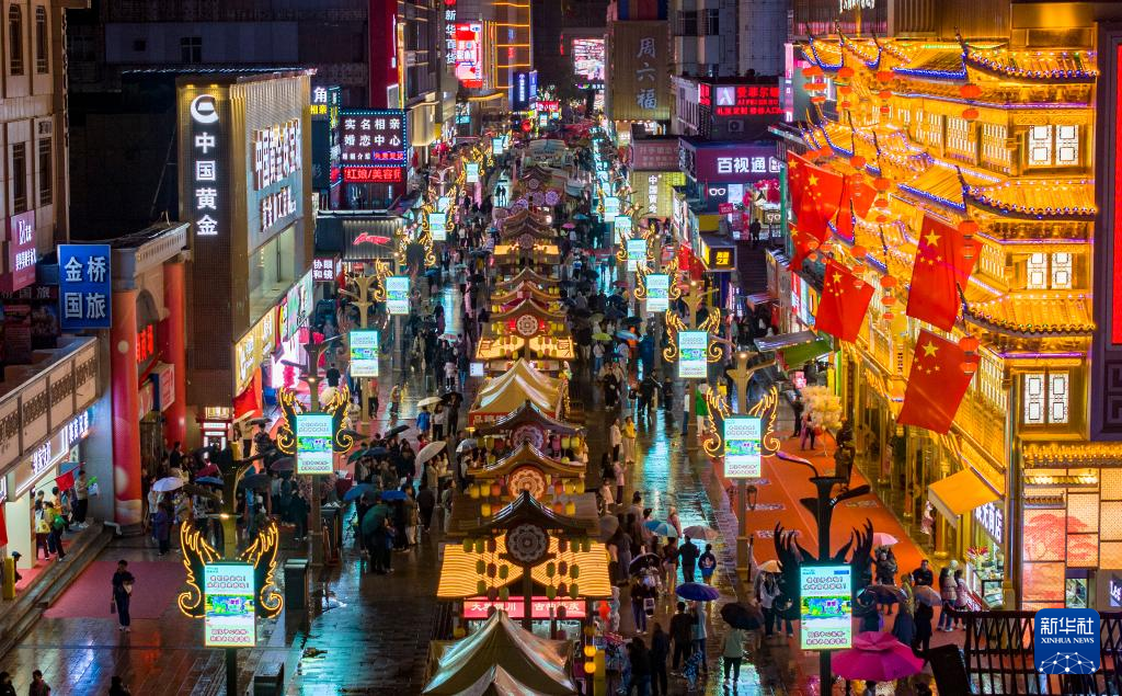 10月5日,游客在宁夏银川市鼓楼步行街游玩(无人机照片)。