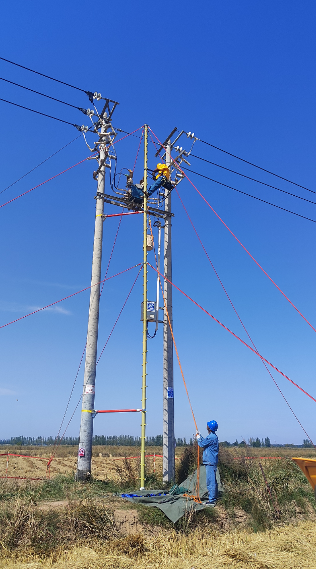 作业过程中,带电作业班成员在农田中对“蜈蚣梯”进行定位打桩、逐节组装并用绝缘缆风绳固定,将近12米高的“蜈蚣梯”平稳立在目标杆位附近。作业人员依托“蜈蚣梯”的稳定支撑,在高空对故障设备进行了精准、高效的带电更换,实现了对联络开关的不停电检修,保障了线路之间的正常负荷转供能力,避免了因设备故障可能导致的用户停电,确保了区域电网的连续稳定运行。