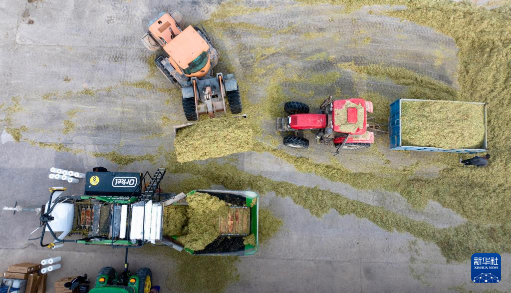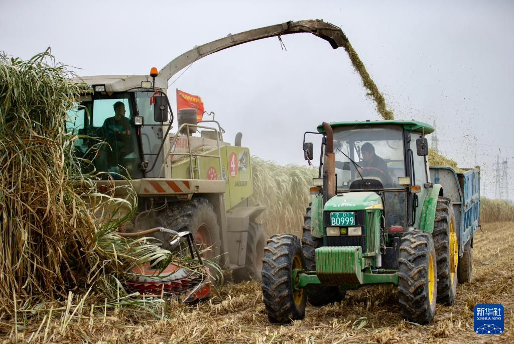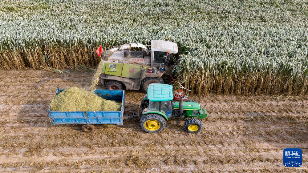 眼下,宁夏银川市永宁县闽宁镇种植的巨菌草进入收割期,当地农户出动机械收获巨菌草,田间一片繁忙景象。据了解,巨菌草收割后将作为青贮饲料,助力当地养殖业的发展。新华社记者 杨植森 摄