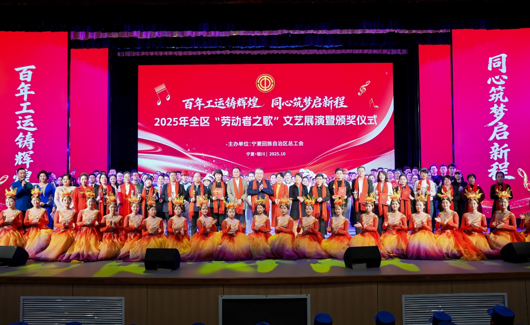10月31日,银川市工人文化宫内华灯璀璨,气氛热烈,由宁夏总工会主办的2025年全区“劳动者之歌”文艺展演暨颁奖仪式在此举行。全区各级劳动模范、获奖单位代表、演职人员及现场观众共400余人齐聚一堂,共同见证了这场属于劳动者的艺术盛宴与荣耀时刻,用精彩的文艺节目深情礼赞劳动之美,激昂唱响时代强音。